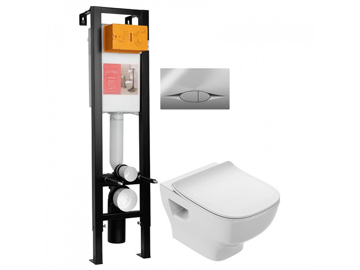 Инсталляция Jacob Delafon 30 см, с безободковым унитазом Struktura EDF102-00, сиденье тонкое микролифт, клавиша хром, комплект E21754RU-00 (E33130RU+EDF102+E70025+E29027-CP)
